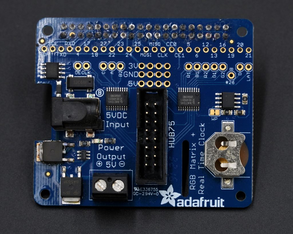 HUB75 interface board: dedicated HAT/hat/adapter. They handle logic level, clock, and sometimes panel power. Commercial boards exist with 5 V terminal block, HUB75 connector, and real-time clock.